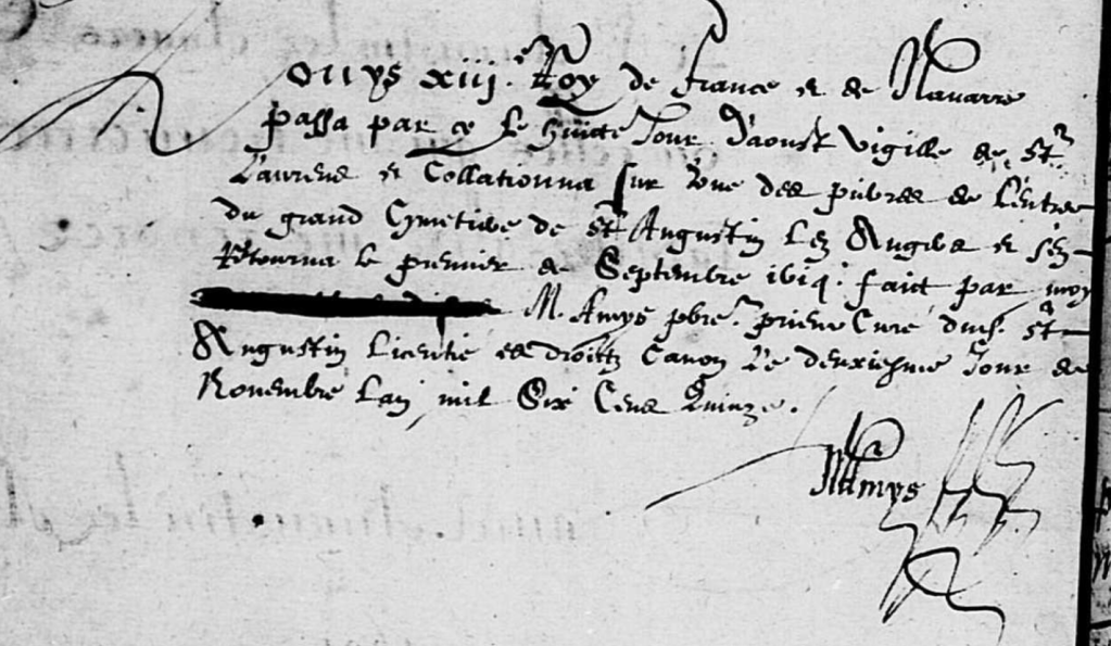 Louis XIII, Roy de France et de Navarre, passa par cy le huictieme jour d’aoust, vigille de Saint Laurent, et collationna sur une des pierres de l’entrée du grand cymetiere de Saint Augustin lez Angers, et s’en retourna le premier de septembre 1614, faict par moy M. AMYS prestre prieur curé dudit Saint Augustin licentié es droitz canon, le deuxiesme jour de novembre l’an mil six cent quinze.