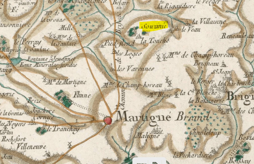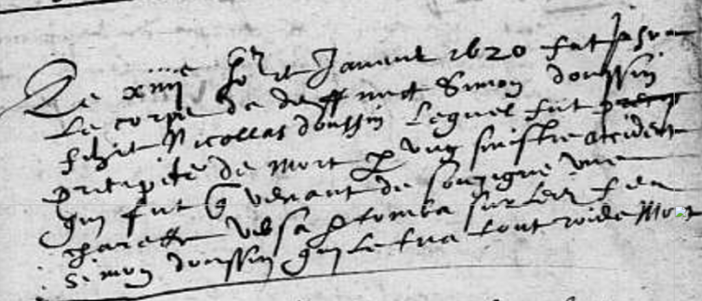 Le xiiii è jour de janvier 1620 fut inhumé le corps de deffuncct Simon DOUSSIN, fils de Nicolas DOUSSIN, lequel fut précipité de mort par ung sinistre accident qui fut que venant de Souzigné, une charrette versa et tomba sur ledit feu Simon DOUSSIN qui le tua tout roide mort.
