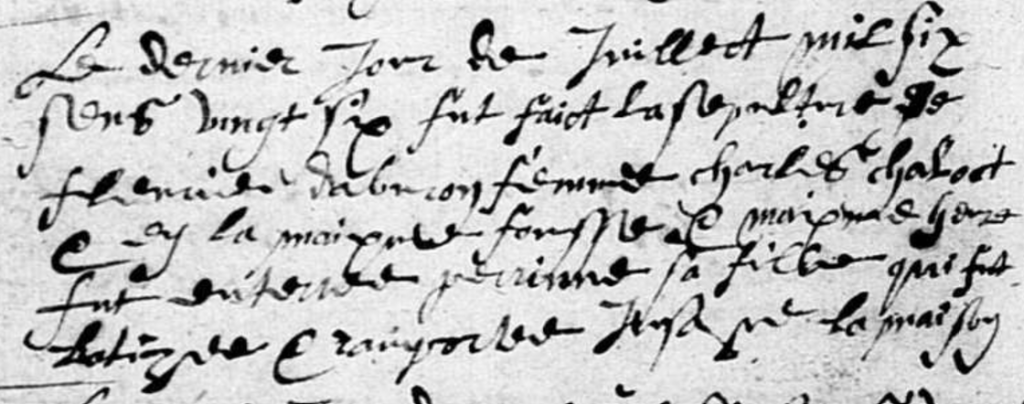 Le dernier jour de juillet mil six cent vingt six fut faict la sépulture de Fleurie DABURON femme de Chales CHALOT et en la maisme fousse et maisme heure fut enterrée Perrinne sa fille qui batizée et ramportée jusque la maison.