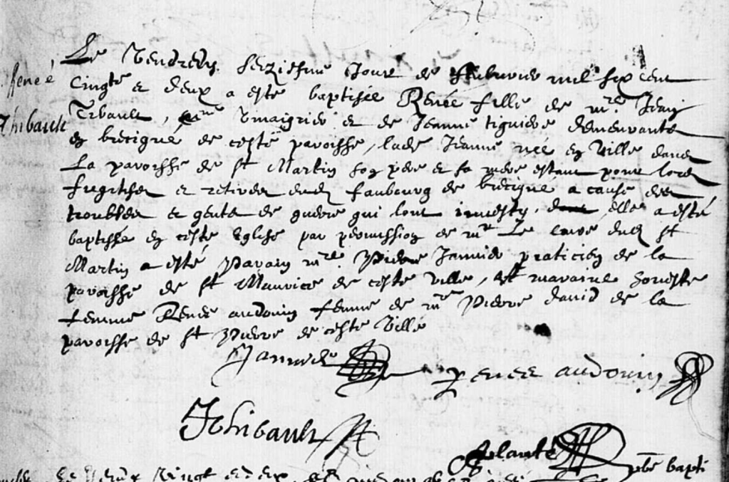 Le vendredy seiziesme jour de feubvrier mil six cent cinquante et deux a esté baptisée Renée fille de Messire Jeaun TIBAULT, maistre vinaigrier et de Jeanne TIGUIERE demeurants en Brécigné de cste paroisse, ladite Jeanne née en ville dans la paroisse de St Martin, son père et sa mère estant pour lors fugitifs et retirés dudit faubourg de Brécigné à cause des troubles et gents de guerrre qui l’ont investy, elle a esté baptisée en ceste église par permission de Mr Le curé dudit St Martin, a esté parain Messire Pierre JANVIER, praticien de la paroisse de St Maurice de ceste ville, et maraine honneste femme Renée AUDOUIN femme de Messire Pierre DAVID de la paroisse de St Pierre en ceste ville.