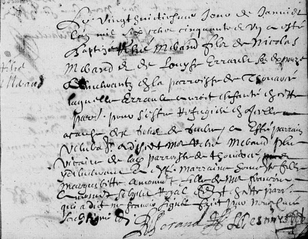 Le vingt huictiesme jour de janvier l’an mil six cent cinquante et un a esté baptizé René MERAND fils de Nicolas MERAND et de Louyse ERRAULT son espouze demeurantz en la paroisse de Thouarcé, laquelle ERRAULT auroit enfanté en ceste parroisse pour s’estre réfugiée en icelle à cause des gens de guerre, a esté parrain Vénérable et discret Messire René MERAND prestre vicaire de ladite paroisse de Tohouarcé et y demeurant, et a esté marraine Honneste fille Marguerite AMONNET, fills de Messire François AMONET sergent royal demeurant en ceste parroisse qui a dict ne scavoir signer. Faict par nous curé soussigné.