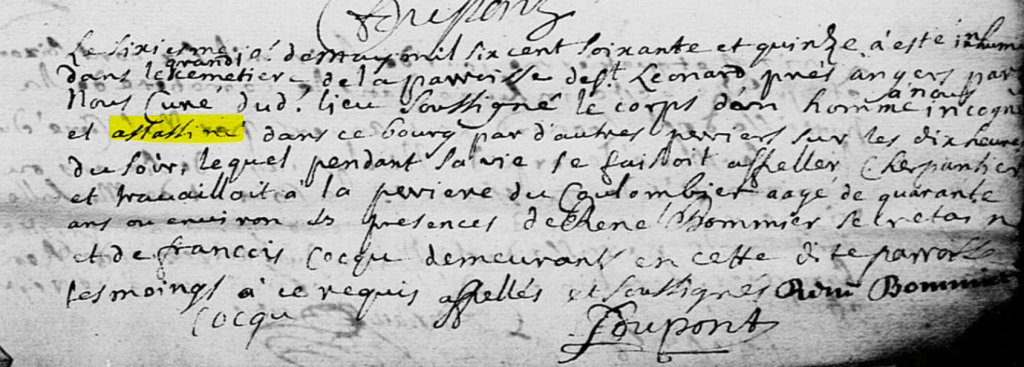 Le sixiesme jour de may mil six cent soixante et quinze a esté inhumé dans le grand cimetiere de la parroisse de St Leonard près Angers par nous curé dudit lieu soussigné, le corps d’un homme à nous incognu et assassiné dans ce bourg par d’autres perriers sur les dix heures du soir, lequel pendant sa vie se faisoit appeller CHERPANTIER et travaillait à la perrière du Coulombier, aagé de quarante ans ou environ, es présences de René BOMMIER secretain et de François COCQU demeurant en cette dite parroisse tesmoings à ce requis, appellés et soussignés.