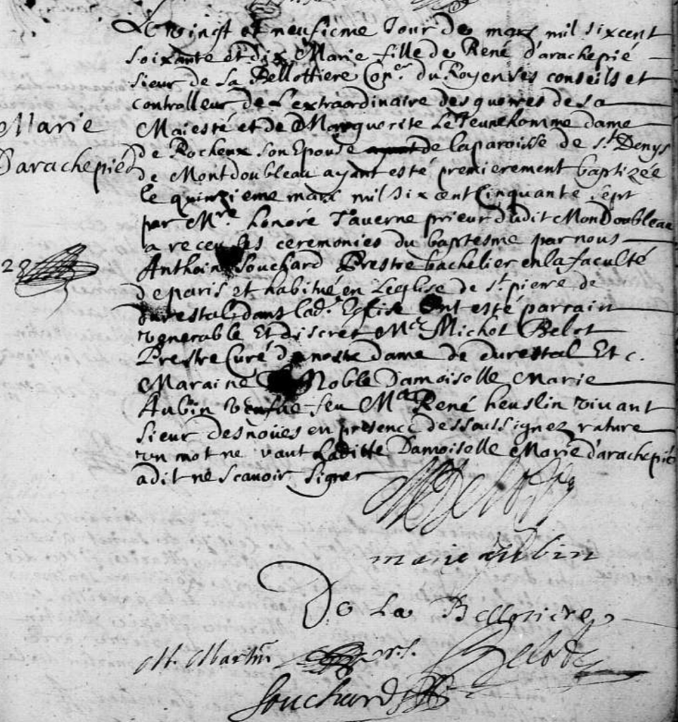 Le vingt et neufiesme jour de mars mil six cent soixante et dix marie fille de René D’ARACHEPIÉ, sieur de La Bellottière, conseiller du Roy en ses conseils et controlleur de l’extraordinaire des guerres de sa Majesté de Marguerite LEJEUNEHOMME dame de Rocheux son épouse, de la paroisse de Saint Denys de Mondoubleau, ayant esté premierement baptizée le quinzième mars mil six cent cinquante sept par Messire Honoré TAVERNE prieur dudit Montdoubleau, a receu les ceremonies du baptesme par nous Anthoine SOUCHARD, Prestre bachelier en la faculté de Paris et habitué en l’église de Saint Piere de Durestal dans ladite église, ont esté parrain venerable et discret Messire Michel BELOT prestre curé de Nostre Dame de Durestal et marraine Noble Damoiselle Marie AUBIN veufve feu Maister René HEUSLIN vivant sieur des Noües en presence des soussignez, raturé un mot ne vaut, laditte Damoiselle Marie D’ARACHEPIÉ a dict ne scavoir signer.