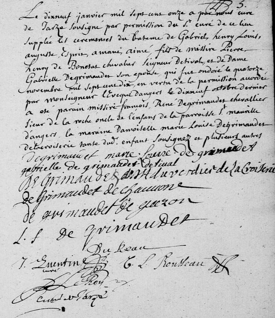Le dixneuf janvier mil sept cent onze a par nous curé de jarzé sousigné par permission du sieur curé de ce lieu suppléé les ceremonies du bateme de Gabriel, Henry, Louis, Auguste, Esprit, Amant, Aimé, fils de Missire Pierre Henry de BONETAT chevalier seigneur d’Etival et de Dame Gabrielle de GRIMAUDET son épouse, qui fut ondoié le quatorze novembre mil sept cent dix, en vertu de la permission accordée par Monseigneur l’Eveque d’Angers le dix neuf octobre dernier, a eté parain Missire François René De GRIMAUDET chevallier sieur de la Roche, oncle de l’enfant, de la paroisse St Maurille d’Angers, la maraine Damoiselle Marie Louise de GRIMAUDET de La CROISERIE, tante dudit enfant sousignéz et plusieurs autres.