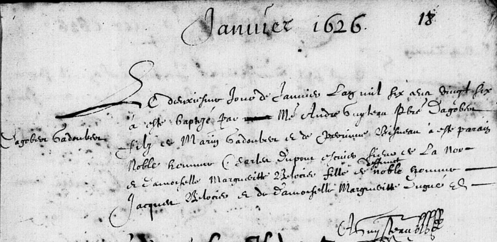 Le deuxiesme jour de janvier l’an mil six cent vingt six a esté baptizé par Me André GUYTEAU prestre, Dagobert fils de marin GADOUBERT et de Perrine BISVEAU, a esté parrain Noble homme Charles DUPONT, escuier, sieur de la Noe, et damoiselle Marguerite BELOCIER, fille de défunt noble homme Jacques BELOCIER et de damoiselle Marguerite DUGUÉ.
