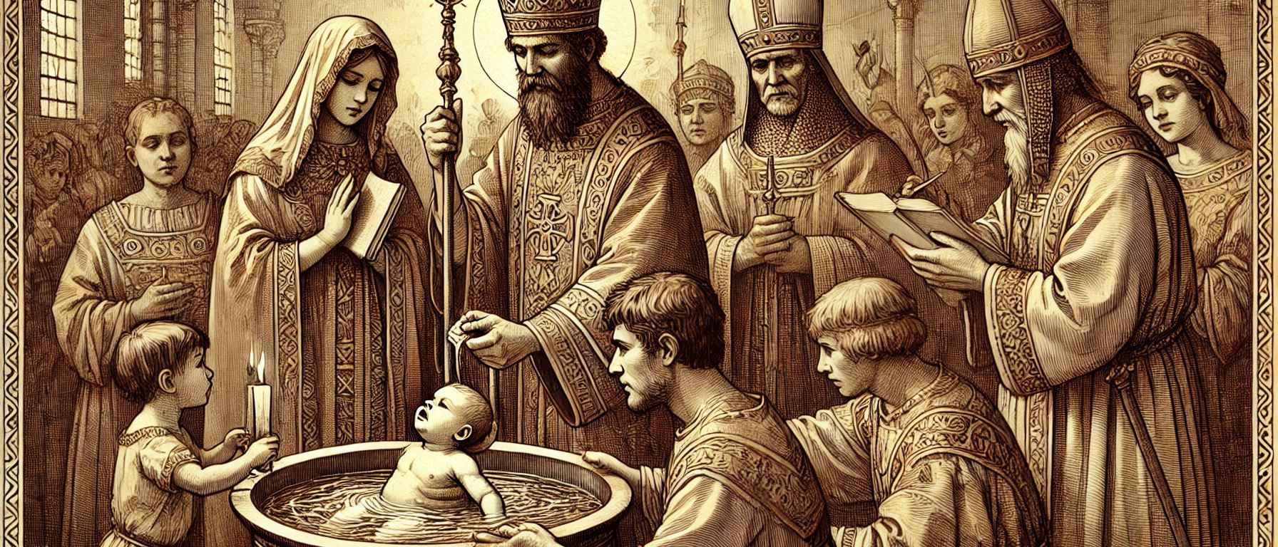 Je les crée à l’aide d’une IA : j’écris les mots qu’il faut et c’est elle qui fabrique l’image. Parfois je m’y prends de nombreuses fois… Ici c’était « Epoque médiévale, baptême d’un bébé dans une petite église médiévale, dessin couleur sépia ». J’utilise le créateur d’image « Microsoft Bing ».