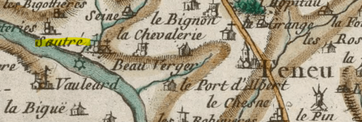 Au confluent du ruisseau de la Suine dans la Mayenne, qui y forme deux jolies îles. La terre appartenait au XIIe siècle au seigneur de Feneu, qui y fonda la chapelle Notre-Dame, plus tard qualifiée de prieuré du Bignon (Voir ce mot), au profit des moines de Saint-Nicolas d’Angers. On y voit un fief distinct, avec château-fort, constitué au XIIIe siècle dont est seigneur Robert des Champs (1248) ; Hardouin de la Haie-Joulain (1312), Briant de la Haie-Houlain (1384, 1408) qui rend aveu au château d’Angers « pour son chastel et appartenances avec les douves », fours et pressoirs banaux à Feneu, moulins à blé et à draps. Catherine de la Haie-Joulain, l’apporte à Jean de Sainte-Maure ; Charles de Sainte-Maure (1458,1478) ; Jacques de Daillon (1529), chambellan ordinaire du roi, sénéchal d’Anjou ; Guy de Daillon (1563), fait prisonnier à Coutras. La place, interceptant la Sarthe et la Mayenne et toutes les communications par Cantenay avec le Maine et la Normandie, devint une des visées des guerres civiles. Prise et reprise, elle était occupée en 1591 par le sieur de Quincé avec une garnison de soldats royaux, qui se laissa surprendre le 9 août par une bande de 18 partisans ligueurs, ayant à sa tête Jean HERVÉ, fermier de la Monnaie d’Angers ; mais dès le lendemain le siège y était mis par deux compagnies, sous les ordres des sieurs de Rambouillet et de Thouarcé, avec poudres, canon et vivres fournis par la ville d’Angers. Le 13, HERVÉ blessé accepta la capitulation qui lui accordait d’être conduit avec ses gens à Rochefort-sur-Loire, poste important de la Ligue. La mairie d’Angers, en fournissant tout secours, requit le démantellement et le rasement du château « attendu les ruysnes qu’il a toujours apporté au païs, de la despence qu’il a convenu faire à le reprendre par plusieurs foys. » Une commission royale en date du 16 août fut délivrée pour satisfaire aux sollicitations pressantes des habitants. Néanmoins le château, resté debout encore, fut investi le 18 février et occupé le 20 par les ligueurs de Boisdauphin, mais repris de nouveau de nuit et sans combat par le capitaine Des COURANS. Pendant la fronde, l’abbé ARNAUD y trouva encore refuge contre le sieur de Rohan, qui le voulait faire arrêter. Il était advenu depuis les premières années du XVIIe siècle par le mariage d’Hélène de Daillon à François de Chabannes, baron de Chalus, qui prend le titre de baron de Sautré, quoique la terre n’eût qualité que de simple châtellenie. René LECLERC, sieur des Roches et des Aunais, marie de Renée LICQUET, l’acquit en 1617 et ses héritiers y résident pendant plus de deux siècles. […] Outre la chapelle du Bignon, qui est dite en 1777 « sise dans la cour de Sautré », le château avait sa chapelle seigneurialle dès le XVe siècle, dédiée à Saint Thomas et vulgairement appelée de la Planche. Le dernier chapelain François LOUET périt, dit-on, dans une noyade à Montjean le 29 novembre 1793. (Pour en savoir plus. Célestin Port, Sautré.)
