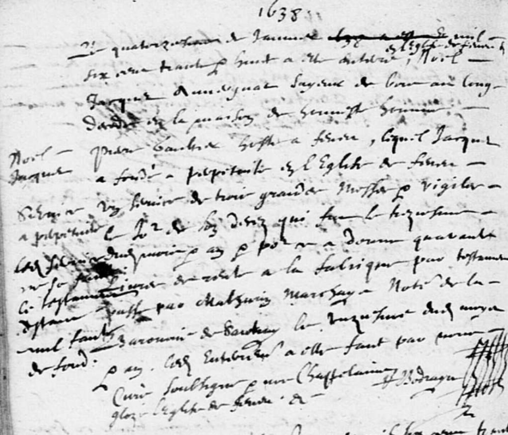 Le quatorziesme jour de janvier mil six cent trante et huict a esté enterré en l’église de Feneu, Noël JACQUET, auvergnat, scyeur* de bois au long, décédé en la maison de honneste homme Pierre GAULTIER, hoste à Feneu, lequel JACQUET a fondé à perpétuité* en l’église de Feneu un service de trois grandes messes et vigiles le jour de son decez qui fut le treziesme dudit mois et an et pour ce a donné quarante livres de rente à la fabrique par testament passé par Mathurin MARCHAYS notaire de la baronnie de Sautray*, le unziesme dudit moys et an, ledit enterrement a esté faict par nius curé soubsigné et nos chappelains. (gloze l’église de Feneu).