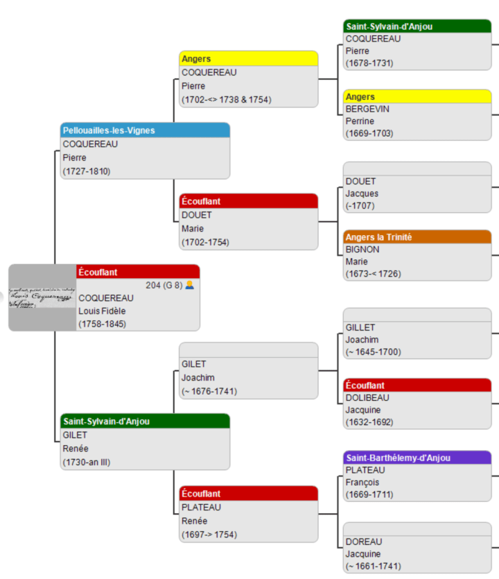 Ce merveilleux tableau m’apprend qu’un degré de parenté du 3ème au 4ème degré signifie qu’au moins un des conjoints du couple des arrières grands parents de Louis Fidèle COQUEREAU est le même qu’au moins un des conjoints du couple des arrières arrières grands parents de Jeanne BARDOUL.