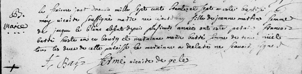 Le sixieme jour d’aoust mille sept cent trente et sept a esté baptizé par moy vicaire soussigné Marie née ce jour d’huy, fille de Jeanne MARTIN, femme de Jacque LE BLANC absent depuis plusieurs années, ont esté parain François BARRÉ hoste en ce bourg, et marainne Marie BARRÉ femme de René HUET, tous les deux de cette paroisse, la marainne a declaré ne scavoir signer.