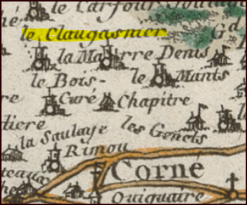 Le Clos-Gasnier. Hameau, commune de Corné. Y décède Louis MENOU, le 14 mars 1694.