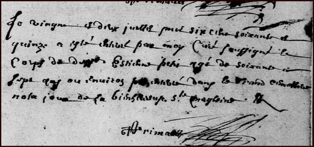 Environ une petite vingtaine de mes ancêtres sont décédées au Pin-en-Mauges, dont Etienne PETIT, enterré dans le grand cimetière, le 22 juillet 1675, jour de la bienheureuse Sainte Magleine.