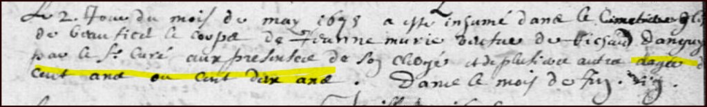 Le 2è Jour du mois de may 1675 a esté inhumé dans le cimetiere de Beauficel, le corps de Jeanne MURIE veufve de Richard DANGUY, par le sieur curé aux presences de son clergé et de plusieurs aultres, aagée de cent ans ou cent deux ans.