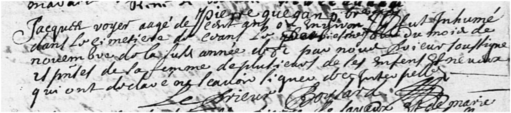 Jacques VOYER, aagé de cent ans ou environ, fut inhumé dans le cimetière de ceans, le deusiesme jour du mois de novembre de la susdite année 1681 par nous prieur soussigné es présences de sa femme, de plusieurs de ses enfens et neveux qui ont declaré ne scavoir signer de ce interpellés. Le prieur Boysard.