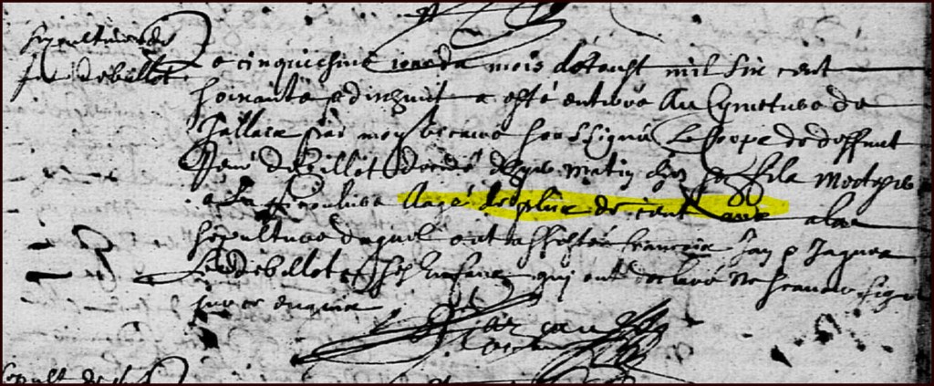 Le cinquiesme jour du mois d’Aoust mil six cent soixante et dix neuf a esté enterré au cymetiere de Jallais par moy vicaire soussigné, le corps de deffunct René DEBILLLOT décédé d’hyer matin chez son fils mestayer à la Picoulière, aagé de plus de cent ans, à la sépulture duquel ont assisté François, Jan et Jacques les DEBILLOTs ses enfants qui ont declaré ne scavoir signer sur ce enquis.