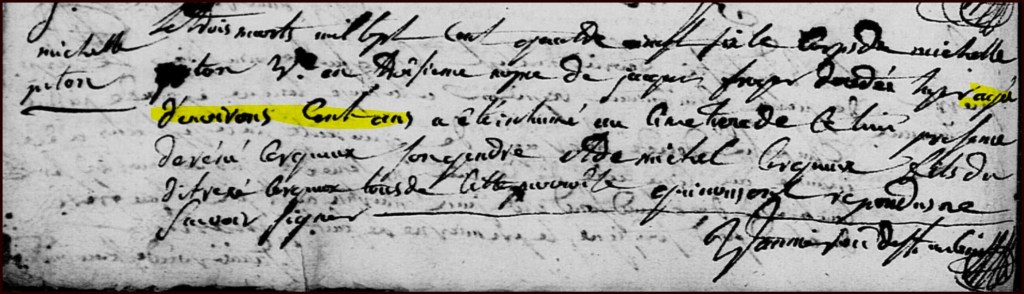 Le trois mil sept cent quatre vingt six le corps de Michelle PITON veuve en troisieme nopce de Jacques FROGER décédée hyer aagée d’environs cent ans a eté inhumé au cimetiere de ce lieu, en presence de René CERQUEUX son gendre, et de Michel BREJAUX fils dudit René BREJAUX tous de cette paroisse et qui nous ont repondu ne savoir signer.