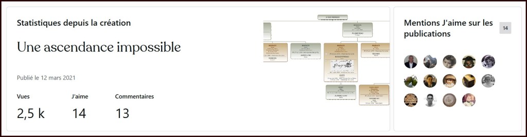 Il me reste donc à retrouver mes ancêtres perdus. Pour cela, j’ai de la chance : un gedcom enregistré sur Geneanet. Mon défi de 2026 sera donc celui-ci : rétablir ma généalogie à l’aide de celle publiée en ligne qui, elle, ne s’est pas perdue !
