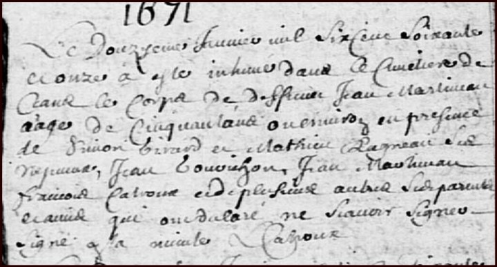 Le douziesme janvier mil six cent soixante et onze a esté inhumé dans le cimetiere de ceans le corps de deffunct Jean MARTINEAU aagée de cinquante ans ou environ en présence de Simon GIRARD et Mathieu RAGNEAU ses nepveux, Jean GOURICHON, Jean MARTINEAU, François CATROUX et de plusieurs autres ses parents et amis qui ont declaré ne scavoir signer.