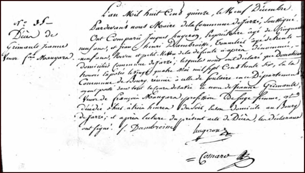 L’an mil huit cent quinze, le 16ème décembre par devant nous maire de la commune de Jarzé soussigné, ont comparu Jacques HUGERON, propriétaire, âgé de cinquante ans, et Jean Henri DAMBROISSE, tonnelier, âgé de trente neuf ans, neveu et petit neveu de la défunte ci-après dénommée, domiciliés commune de Jarzé, lesquels nous ont déclaré que Donatienne, trouvée exposée le vingt quatre mai mil sept cent trente six, en la commune de Bourg réunie à celle de Soulaire en ce département, ayant porté dans tout le cours de sa vie le nom de Jeanne GRIMAULT, veuve de François MAUGARD, profession de sage-femme, est décédée d’hier, à trois heures du soir, en son domicile au bourg de Jarzé, et après lecture du présent acte de décès, les déclarants ont signé.