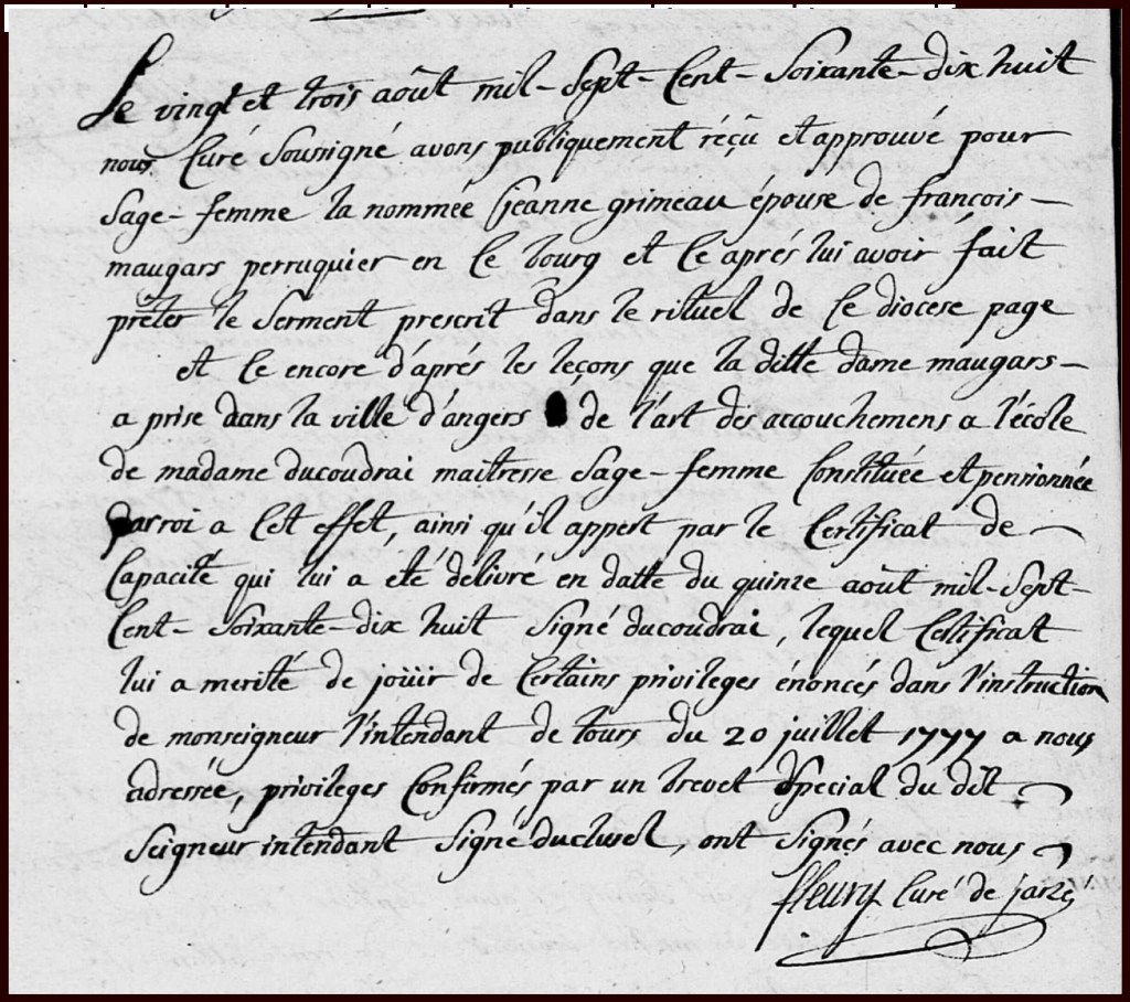 Le vingt et trois août mil sept cent soixante dix huit nous curé sousigné avons publiquement reçu et approuvé pour sage-femme la nommée Jeanne GRIMEAU, épouse de François MAUGARS perruquier en ce bourg et ce après avoir fait prêter le serment prescrit dans le rituel de ce diocèse page [blanc] et ce encore d’après les leçons que la ditte dame MAUGARS a prise dans la ville d’Angers de l’art des accouchemens à l’école de Madame Du COUDRAI, maîtresse sage-femme constituée et pensionnée par roi, a cet effet, ainsi qu’il appert par le certificat de capacité qui lui a été délivré en datte du quinze août mil-sept-cent-soixante-dix-huit signé Du COUDRAI, lequel certificat lui a merité de jouïr de certains privileges énoncés dans l’instruction de Monseigneur l’intendant de Tours du 20 juillet 1777 à nous adressée, privileges confirmés par un brevet special du dict Seigneur intendant signé Du CLUZEL, ont signés avec nous, Fleury, curé de Jarzé.