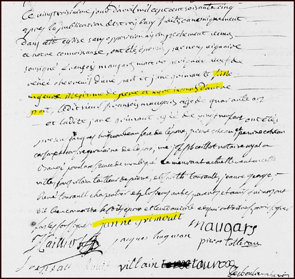 Cet acte nous apprend plusieurs choses, tout d’abord que Jeanne GRIMAULT est une enfant illégitime, née de père et de mère inconnus, mais aussi qu’elle sait écrire, en effent, elle a signé de son nom au bas de l’acte. Elle a donc reçu une certaine instruction. Néanmoins, rien n’indique explicitement qui a pris soin d’elle et quelles sont les personnes qui l’ont receuillie et élevée. Outre la présence des parents de François MAUGARS, tels que son beau-frère, Jacques HUGERON, son cousin et sa cousine germaine, Pierre COTTEREAU et Perrine COTTEREAU, on note la présence de certains noms comme celle de René TOURAULT charpentier, Louis VILLAIN tailleur de Pierre, Elisabeth TOURAULT et Jeanne GEORGE. Qui sont-ils ? Ont-il un lien avec Jeanne GRIMAULT ?
