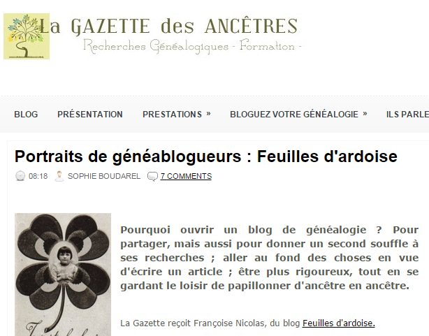 – Portrait de Généablogueurs : Feuilles d’Ardoise, sur le blog de La Gazette des Ancêtres.