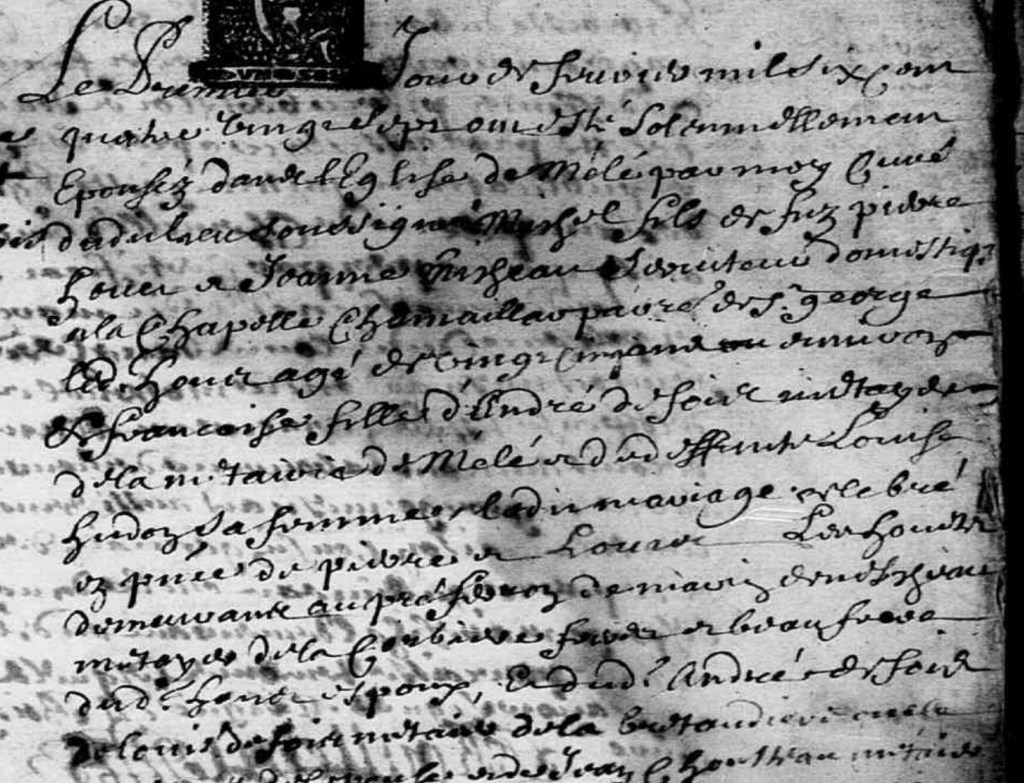 Le premier jour de février mil six cent quatre vingt et sept ont esté solennellement épouséz dans l’église de Melé par moy curé dudit lieu soussigné Michel fils de défunts Pierre HOUET et Jeanne MICHEAU serviteur domestique à La Chapelle Chamaillar, paroisse de Saint George, ledit HOUET agé de vingt cinq ans ou environ et Françoise fille d’André DEFOIS metayer de la métairie de Melé et de défunte Louise HUDON sa femme, ledit mariage celebré en présence de Pierre et Louis les HOUETs demeurants au Préferron, de Marin DENESCHEAU métayer de la Corbière, frères et beau frère dudit HOUET espoux, et dudit André DEFOIS, de Louis DEFOIS metaier de La Bretaudière oncle paternel de l’épouse et de Jean CHOUSTEAU metaier de la Poupelinnière paroisse de Saint George, aussi son oncle paternel […]