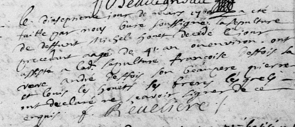 Le dixseptieme jour de mars 1700 a été faite par moy curé soussigné la sépulture de deffunt Michel HOUET decedé le jour précédant agé de 41 ans ou environ ont assisté à ladite sépulture Françoise DEFFOIS sa veuve, André DEFFOIS son beau père, Pierre et Louis les HOUETs ses frères, lesquels ont déclarés ne scavor signer de ce enquis.