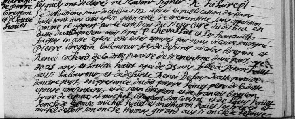 Le dixhuitieme jour d’octobre 1712 après la publication des bans faite tant dans cette église qu’en celle de Trémentine sans opposition comme il appert par le certificat du sieur curé dudit lieu en datte du 16 du presnes mois signé P. CHEVALIER et les fiancailles faittes en cette église ont estés espousés par nous vicaire soussigné Pierre BREGEON laboureur fils de defuncts Nicolas BREGEON et Renée COCHARD de la ditte paroisse de Trmentine d’une part, agé de 25 ans, et Louise HOUET agée de 25 ans, fille de Pierre HOUET aussi laboureur, et de défunte Renée DEFOIS de cette paroisse d’autre part, en présence dudit Pierre HOUET père de ladite épouse consentant, et de Jean BREGEON et de François BREGEON frère de l’époux, et Michel BREGEON son cousin, et de Louis HOUET l’oncle de l’épouse, Michel HOUET et Mathurin HOUET ses frères et Michel DEFFOIS son oncle, THomas GIRARD aussi oncle de l’épouse, tous de cette paroisse exceptés lesdits BREGEON, lesquels ont declarés ne scavoir signer fors les soussignés.