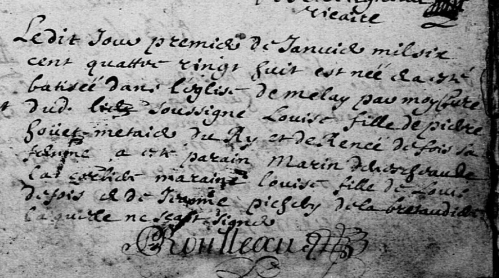 Ledit jour premier de janvier mil six cent quatre vingt huit est née et a esté batisée dans l’église de Melay par moy curé dudit lieu soussigné, Louise fille de Pierre HOUET metaier du Ry et de Renée DEFOIS sa femme, a esté parain Marin DENESCHAULX La Corbière, marraine Louise fille de Louis DEFOIS et de Jeanne PICHERY de la Bretaudière, laquelle ne scait signer.