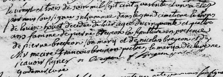 Le vingt et trois de juin mil sept cent quarente et un a été par nous soussigné inhumée dans le grand cimetiere le corps de Louise HOUET decedée de hier agée de cinquante et quattre ans, famme de Pierre BREGEON, la sepulture en présence de Pierre BREGEON son mary, et de Nicolas BREGEON et de MrMecire François BREGEON prêtre, le mary a declaré ne scavoir signer.