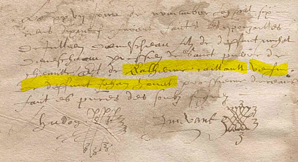 Le xxvii jour de novembre l’an mil six cent dix neuf furent faictes les espouzailles de Jullien DENESCHEAU fils de deffunt Michel DENESCHEAU paroissien de Saint Pierre de Chemillé et de Katherine CAILLAULT veufve de deffunct Jehan HOUET paroissienne de ceans, faict en presence des soubs signez.