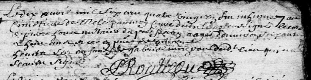 Le dix avril mil six cent quatre vingt un fut inhumé au cometiere de Melé par moy curé dudit lieu soussigné le cors de Pierre HOUET mestaier du Pré Feron aagé d’environ soixante et huict ans et ce en présence de Vincent [blanc] HOUETs ses enfants, de Gabriel MICHEAU dudit lieu qui ne scavent signer.