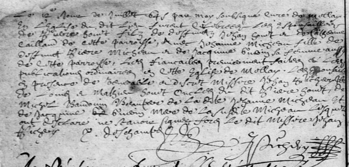 Le 12e jour de juillet 1645 par moy soussigné curé dudit Melay en l’Eglise du dit lieu, furent celebrees les espousailles de Pierre HOUET filz de deffunctz Jehan HOUET et de Catherine CAILLAUD de cette paroisse avec Jehanne MICHEAU fille de deffunct Pierre MICHEAU et de Jecquine GUERIN sa femme aussi de cette paroisse, lesdites fiançailles premièrement faictes […] en présence de Vénérable et Discret Messire Jehan PICHERY prestre, de Louis et Mathieu HOUET oncles du dit Pierre HOUET, de Michel BAUDOUIN beau frère de ladite Jeanne MICHEAU, lesquels ont déclaré ne sçavoir signer fors le dit Missire Jehan POCHERY.