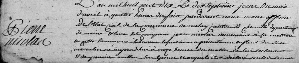 Fils de Jean NICOLAS et de Perrine ONILLON , Pierre NICOLAS, dont la vie traverse le XIXème siècle, était métayer au Bêle, à Melay. En 1844, il épousa Jeanne PINEAU avec laquelle il eut 5 enfants.