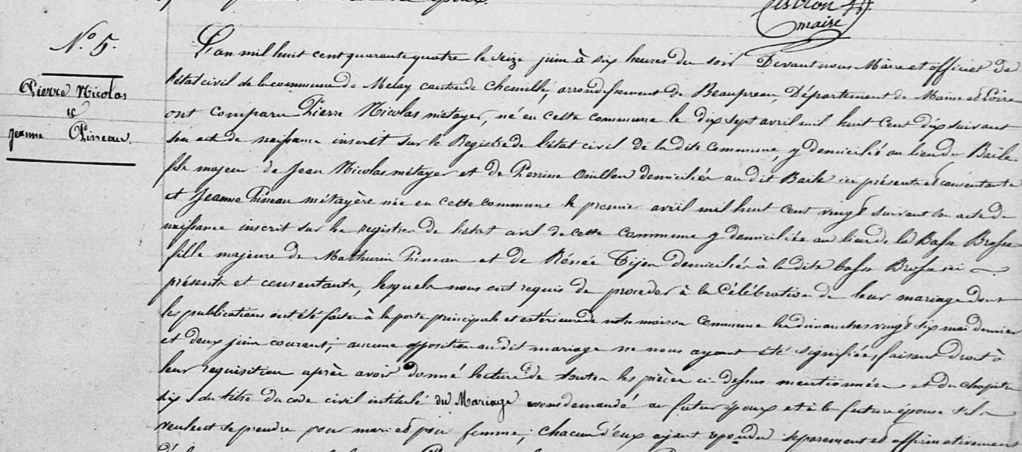 Mariage avec Jeanne PINEAU le 16 juin 1844 à Melay (49)