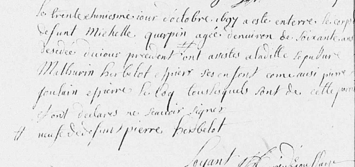 - Marguerite HERBELOT – Baptisée vers 1675. Mariée en 1697 avec Louis CHARDON. (Dont je descends).
