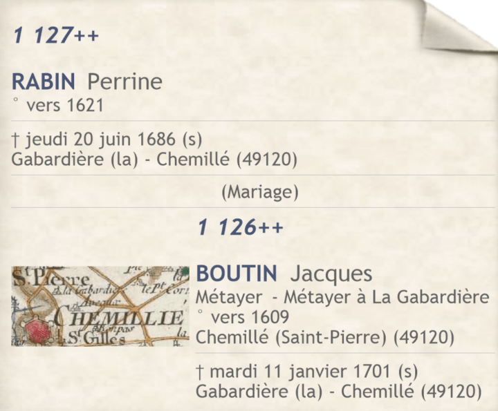 - René BOUTIN (vers1660-?). Marié à Saint-Pierre de Chemillé le 12 juin 1686 avec Michelle DAVY, fille de Jacques DAVY et de Perrine MARTIN.