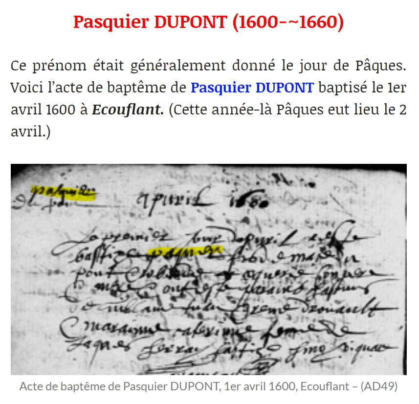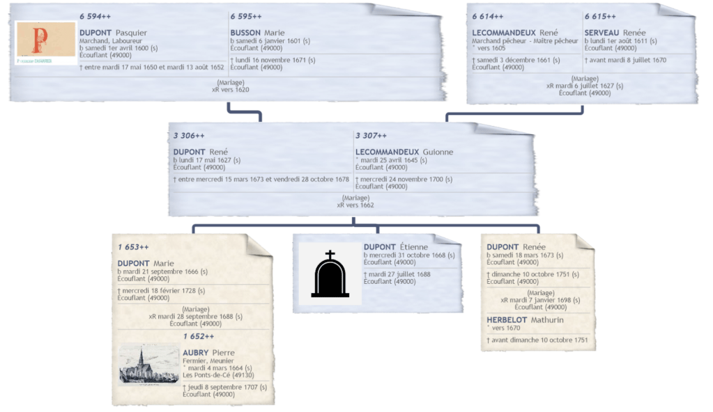 Les registres de mariages des années 1659 à 1668 sont lacunaires à Ecouflant. René DUPONT aura au moins trois enfants, Marie (1666), Etienne (1668) et Renée (1673).