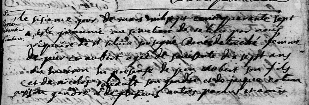 Renée DESTRICHÉ, épouse de Pierre AUBERT, naquit le 19 juillet 1671 au Plessis-Grammoire et s’éteignit 75 ans plus tard à Pellouailles-les-Vignes le 6 mars 1747.