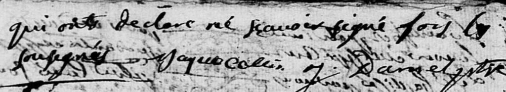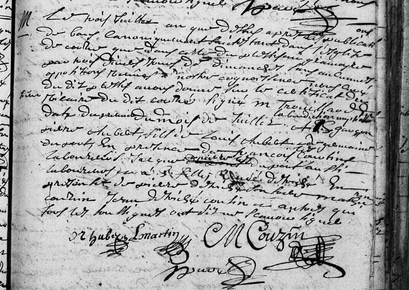 Le trois juillet an que dessus [1696] apres les publications des bans canoniquement faictes tant dans l’esglise de Corzé que dans celle du Plessis au Grammoyre par trois divers jours de dimanches sans aucunes oppositions venues à nostre cognoissence, nous curé du dit Plessis avons donné sur le certificat du sieur vicaire du dit Corzé, signé M. TROUILLARD en date du premier du mois de juillet, la bénédiction nuptialle à honnête garçon Pierre AUBERT, fils de Louis AUBERT et de Germaine DUPONT, en présence de François les COURTINS laboureurs, Jacques et Pierre les DUPONT aussi laboureurs, et à honnête fillle Renée DESTRICHE en présence de Pierre DESTRICHE son frère, Mathurin COUZIN, Jean DESTRICHE cousin et autres qui fors les soussignés ont dit ne sçavoir signer. R. Hubert – L. Martin – M. Couzin.