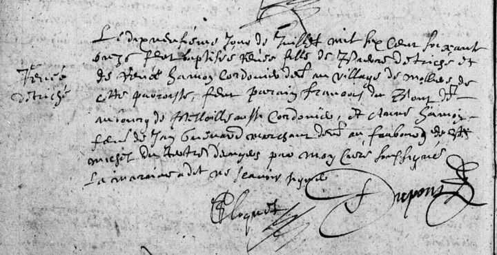 Le dixneufiesme jour de juillet mil six cent soixante unze feut baptisée Renée, fille de Pierre DESTRICHÉ et de Renée HAMON cordonnnier demeurant au village des Mollières de cette paroisse, feut parain François DU PONT demeurant au bourg de Pelloilles aussi cordonier, et Anne HAMON femme de Jan GAISNARD marchand demeurant au faubourg de Saint Michel du Tertre d’Angers…