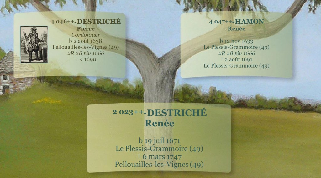 Pierre DESTRICHÉ, baptisé le 7 septembre 1667 à Pellouailles, marié le 4 juillet 1690 à Perrine JOUBERT et décédé le 11 octobre 1713 à Saint-Sylvain-d’Anjou. Ses soeurs assistent à sa sépulture.