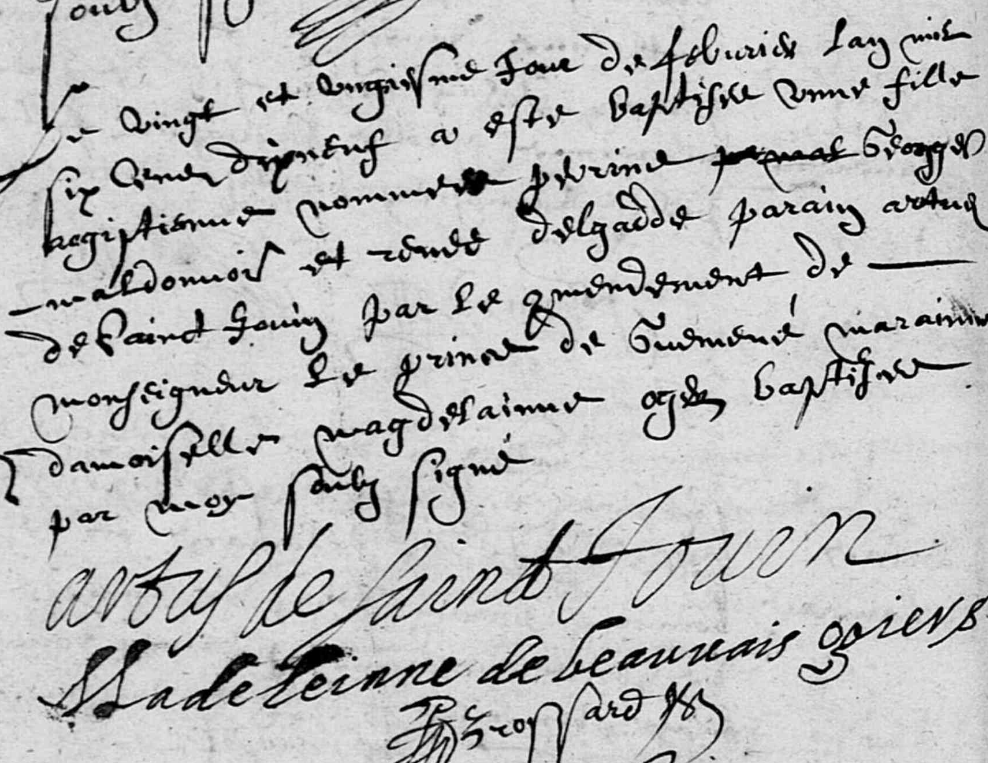 - 21 février 1619, Seiches-sur-le-Loir. « Le vingt et ungiesme jour de febvrier l’an mil six cent dix-neuf, a esté baptisée une fille aegiptienne, nommée Perrine [fille de] Georges MALDONNOIER et Renée DELGADDE, parrain Artus De SAINCT-JOUIN par le commandement de Monseigneur le prince de Guéméné, marraine Magdelaine OGER, baptisée par moy soubssigné. »