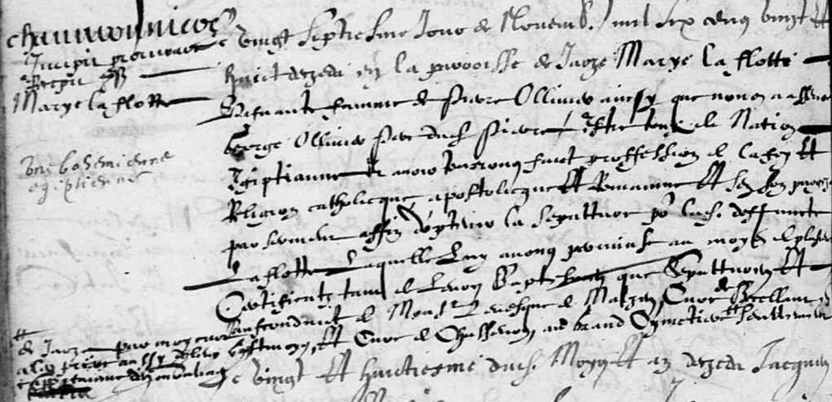 - 27 novembre 1628, Jarzé. « Le vingt septième jour de novembre mil six cens vingt et huict décéda, en la paroisse de Jarzé, Marye LA FLOTTE, vivante femme de Pierre OLLIVIER, ainsy que nous en a assuré George OLLIVIER, père du dit Pierre, estre tous de nation Egiptienne et avoir tousjours fait profession de la foi et religion catholique, apostolicque et romainne et seu son progez par serment affin d’optenir la sépulture pour ladite deffuncte LAFLOTTE, laquelle luy avons perminse au moyen de plusieurs certificats tant de leurs baptesme que sépultures et sauf-conduit de Monsieur l’evesque de Malgin, curé de Brellant en Gastinoys et curé de Chasseron, au grand cymettière de Jarzé, par moy curé, à la prière aussy de leur capitaine [dit Moulin ?]. » [Ecrit en marge Une bohémienne égiptienne.]