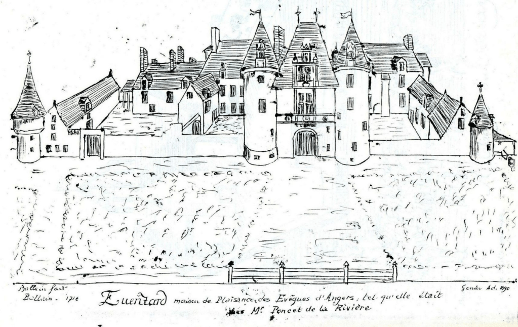 Eventard, château, commune d’Ecouflant. – Manerium seu herbegamentum domini episcopi de Eventard 1281 (H.-D. B 32, f. 36). – Eventard 1337 (Ib.). – Manerium episcopi quod vocatur Eventard 1314 (G 7, f. 125). – Robert de Chaufour fit don de la terre à l’évêché d’Angers et l’évêque Nicolas Gellant y construisit en 1280 un manoir qui devint et resta jusqu’au XVIIIe siècle la maison de plaisance de ses successeurs et la première étape où ils se préparaient à leur installation, – par chacun d’eux embelli, mais surtout augmenté par Michel Lepelletier, en dernier lieu par Michel Poncet de la Rivière. En septembre 1626 il servit de refuge pendant la contagion aux Ursulines d’Angers, V. Louvet dans la Revue d’Anjou, 1856, t. I, p. 299. Le naïf Bruneau de Tartifume, Mss. 871, t. II, p. 120-137, nous a laissé un dessin et une description de ce qu’il y a vu de son temps : sur le portail un écusson écartelé des armes du Chapitre de St-Maurice et de la famille de Mathefelon ; au-dessus de la plus haute croisée, dans une niche, la statue de St-Maurice ; à l’entrée, sur la gauche, une galerie « en laquelle sont arrangées les représentations de 8 cerf en relief », portant au cou des écussons d’évêques ; sur la porte de la chapelle, les armes de Guillaume Ruzé ; au sortir, un bois de haute futaie, percé de longues et belles allées avec berceaux et cabinets de verdure, et au bout de l’allée centrale, un jeu de mail ; dans le bois, un petit oratoire, enceint d’une petite douve, et qu’on racontait avoir servi aux méditations des premiers évêques Apothème, René, Aubin, Maurille. – Ce qui est plus certain, c’est que la duchesse d’Anjou, quand elle se trouvait dans la province, réunit souvent les conseillers de sa Chambre des Comptes au château d’Eventard, Mss. 867. – La terre relevait de Beuzon. – Outre le dessin de Bruneau de Tartifume (XVIIe siècle), on en a une vue du XVIIIe siècle par Ballain (Mss. 867. p. 520), – un très veau plan du château et du parc donné par M. Guillory au Musée d’antiquités, – et un autre dessin, dans son état d’il y a quarante ans, par Berthe, Mss. 896, f. 44. – l’acquéreur par vente nationale fit abattre les grands bâtiments, les bois taillis, les charmilles. Il reste encore pourtant, sur une des faces de l’ancien château, le pavillon de l’ancienne porterie, entre deux tourelles élancées avec lucarnes du XVIe siècle et cadran en ardoise, aux armes et à la devise de l’évêque J. de Vaugirault et la date 1753, – une chambre avec l’inscription : Charles Miron, évêque d’Angers, m’a fait faire 1609, et ses armoiries, – deux portes à fronton circulaire, accostées de balustrades, quelques servitudes, et sur la face opposée une magnifique terrasse à balustrade, XVIIe siècle. M. Morel a donné deux vues de ce logis dans ses Promenades artistiques, Angers, 1872.