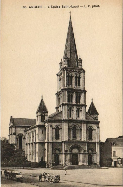 Curés : 1590, 18 février, sép. de Pierre JULLIAN ; 1685, Pierre Le ROYER ; 1741, 23 janvier, sép. de Pierre HARDIE : 1717, 1er mars, sép. de Germain BELOT. Au moment de la Révolution, était curé Etienne-ALexandre BERNIER (1762-1806), docteur en téhologie, installé le 23 mars 1790. Il refusa le serment constitutionnel et joua, dans la guerre de Vendée et les négociations du Concordat, un rôle important. (Chanoine Leflon, Etienne-Alexandre Bernier, Paris, 1938. – Quéruau-Lamerie, Le Clergé de Maine-et-Loire pendant la Révolution, pp. 21-23.) L’église fut détruite à la Révolution. Au concordat, la paroisse fut installée dans la chapelle des Récollets, qui fut remplacée par l’église actuelle (E. Dainville, archit.), consacrée le 10 avril 1876 par Mgr Freppel, en présence du maire d’Angers, du vicomte de Cumont, du colonel du 10e cuirassiers, etc… (Anjou historique, 1912, p. 330 ; – 1943, p. 122.) L’église, à son inauguration, fut jugée comparable en beauté aux monuments du Moyen âge. La reconstruction de l’église avait d’abord rendu nécessaire l’achat, d’une propriété (succession Vaslin) pour 30.000 fr. La Ville donna 16.500 fr. en 10 annuités et la fabrique couvrit le reste au moyen de dons. L’église elle-même coûta 387.000 fr. La fabrique emprunta 65.000 fr., la Ville donna 110.000fr., l’Etat accorda un secours de 30.000fr. La première souscription avait produit 107;000 fr. Les 75.000 fr. restant furent couverts par de nouveaux dons. Les autels, vitraux, orgues et ornements furent ajoutés par plusieurs donateurs. En 1887, la célèbre Vierge du Salve, vierge royale en marbre blanc, datant de la fin du XIIIe s. ou du début du XIVe (classée par arrêté du 25 novembre 1906) fut replacée en l’église St-Laud. Elle se trouvait auparavant gisant en deux morceaux au logis de Douzillé. Elle a été restaurée par M. Belouin qui a refait la tête de l’Enfant Jésus, la main droite, le bras et le nez de la Vierge. Un moulage de cette statue existe au musée de l’Evêché. Le bombardement du 29 mai 1944 fut particulièrement meurtrier pour l’église, dont les voûtes furent crevées, les toitures dévastées. Heureusement, la Vierge avait été évacuée en 1943. Le service paroissial fut transféré à N.-D.-de-Lourdes et dans les chapelles de secours. L’église a été restaurée de 1950 à 1960. La flèche a été entièrement reconstruite. Les nouvelles paroisses Ste-Bernadette et St-martin-des-Champs (V. ces noms) ont été détachées de la paroisse St-Laud qui comptait 10.500 hab. en 1960.