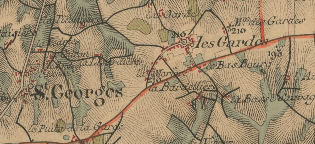 Saint-Georges-du-Puy-de-la-Garde, canton de Chemillé (7 kil.), arrond. de Cholet (15 kil. 1/2) ; – à 45 kil. d’Angers. – Ecclesia sancti Georgii de Podio de Guarda 1107 circa (Cartul. de Chemillé, ch. 16). – Sanctus Georgius de Podio Garde 1107 (Ib., Ch. 17). – Sanctus Georgius de Podio quod dicitur de Garda 1120 (Ibid., ch. 20). – Sanctus Georgius ad montem de la Guarde 1231 (Chemillé, ch.or.) – Saint-Georges-du-Puy-de-la-Garde 1476 (Ib., Cart., pap., ch. 108). – En partie sur la crête, dominée par les Gardes (210 mètres), qui va s’baissant jusqu’à la plaine, du Sud (170 mèt.) au N. et N.-O. (132-120 et même 102 mèt.). – Entre Chemillé et Mêlay (7 kil.) au N., Mêlay et les Gardes (2 kil.) à l’E., les Gardes, la Tour-Landry (5 kil. 1/2) et Trémentines (4 kil. 1/2) au S., Trémentines et la Chapelle-Rousselin (9 kil.) à l’O.