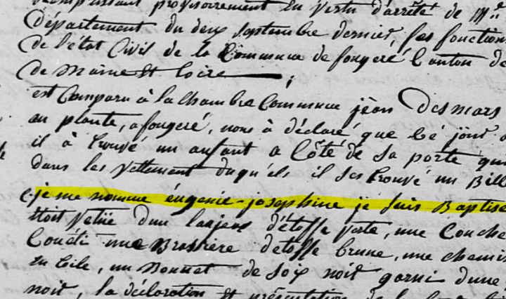 Jour 18 – Calendrier de l’Avent 2020 Eugénie Joséphine DESPLANTES (1830-1830) Voici une petite fille dont les prénoms ont été choisis par sa mère qui, avant de l’abandonner, a réussi à trouver un moyen qu’ils lui soient transmis… Déclaration d’Eugénie … Continuer de lire Eugénie Joséphine DESPLANTES et son petit billet de baptême, Fougeré, 1830
