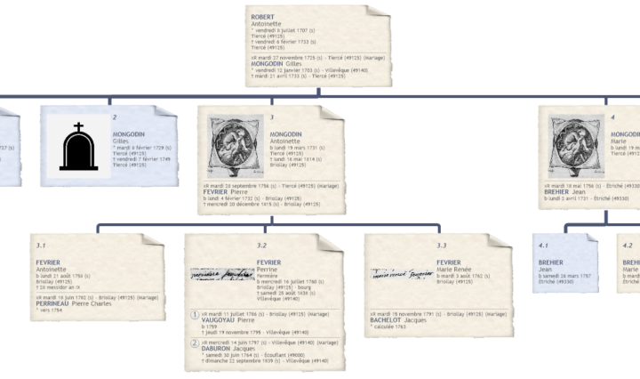 Antoinette ROBERT (1707-1733) Morte en couches 100 mots pour une vie Fille de Pierre ROBERT et de Sébastienne RIFLE, Antoinette ROBERT, dite Toinette, naquit le 8 juillet 1707 à Tiercé. En 1725, elle et sa soeur Perrine, se marièrent le … Continuer de lire T comme TOINETTE